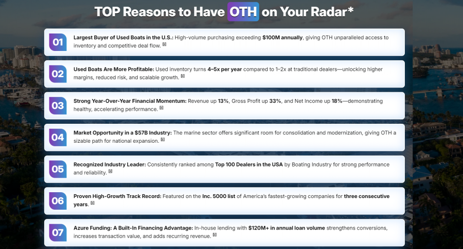At the center of OTH's growth thesis is the launch of NextBoat AI, an industry-first platform designed to eliminate inefficiencies in boat buying and selling. Built on years of proprietary transaction data and refined across thousands of deals, this platform enables faster, smarter, and more accurate vessel matching.