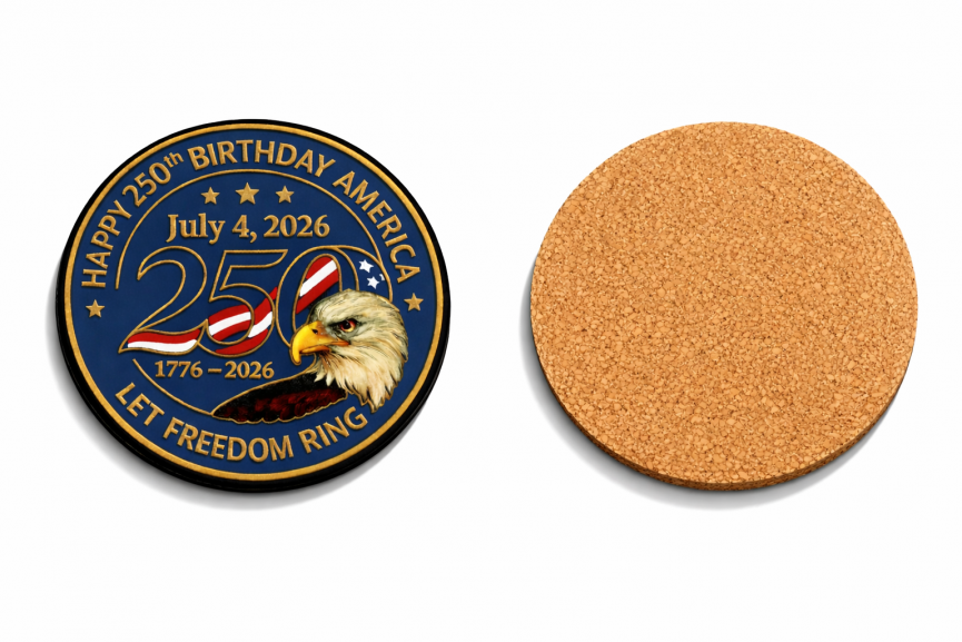 The collection features commemorative 2-inch collectible challenge coins, FlexStyle® caps with woven patches, and premium PVC/rubber coasters with cork backing, all built around an original emblem created exclusively by Pacific Emblem Company. These are lasting keepsakes designed to capture the pride and significance of America's 250th birthday.
