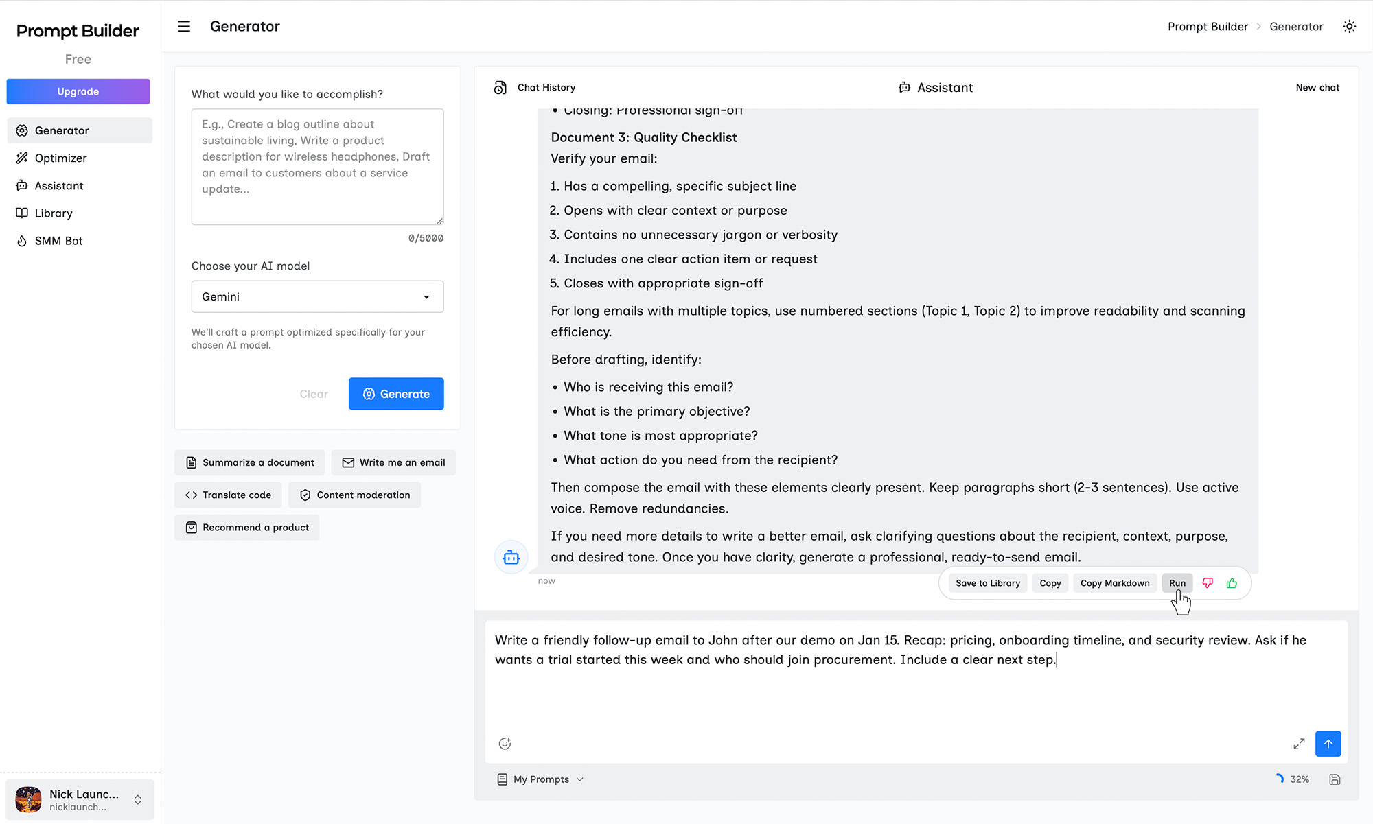 "Most people don't need more prompts they need prompts that work reliably for the model they're using today," said Nick, Founder at Prompt Builder. "Prompt Builder makes it faster to generate a strong first draft, improve it with iteration, and then reuse it whenever the workflow comes up again."