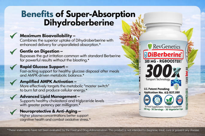 MIAMI - ColoradoDesk -- RevGenetics is disrupting the metabolic support market today with the commercial launch of DiBerberine 300x, an advanced enteric-coated dihydroberberine (DHB) supplement. By directly addressing the industry-wide "berberine absorption gap," RevGenetics exposes a flaw found in nearly every major competing brand: the failure to protect the active compound from stomach acid degradation and P-glycoprotein (P-gp) efflux pumps.